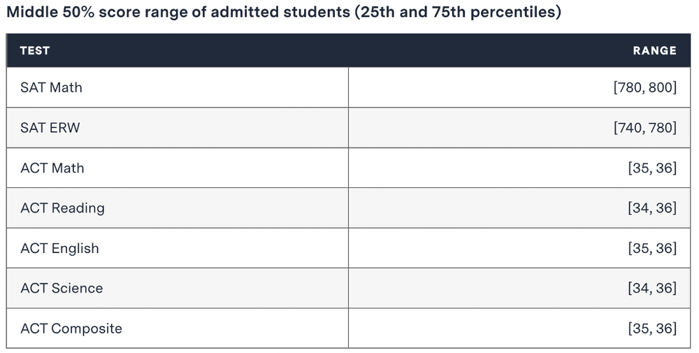 In all categories except SAT ERW, the 75th percentile was a perfect score, meaning that 25% or more of all admitted students had a perfect score. You need to be in this range to be a serious candidate.