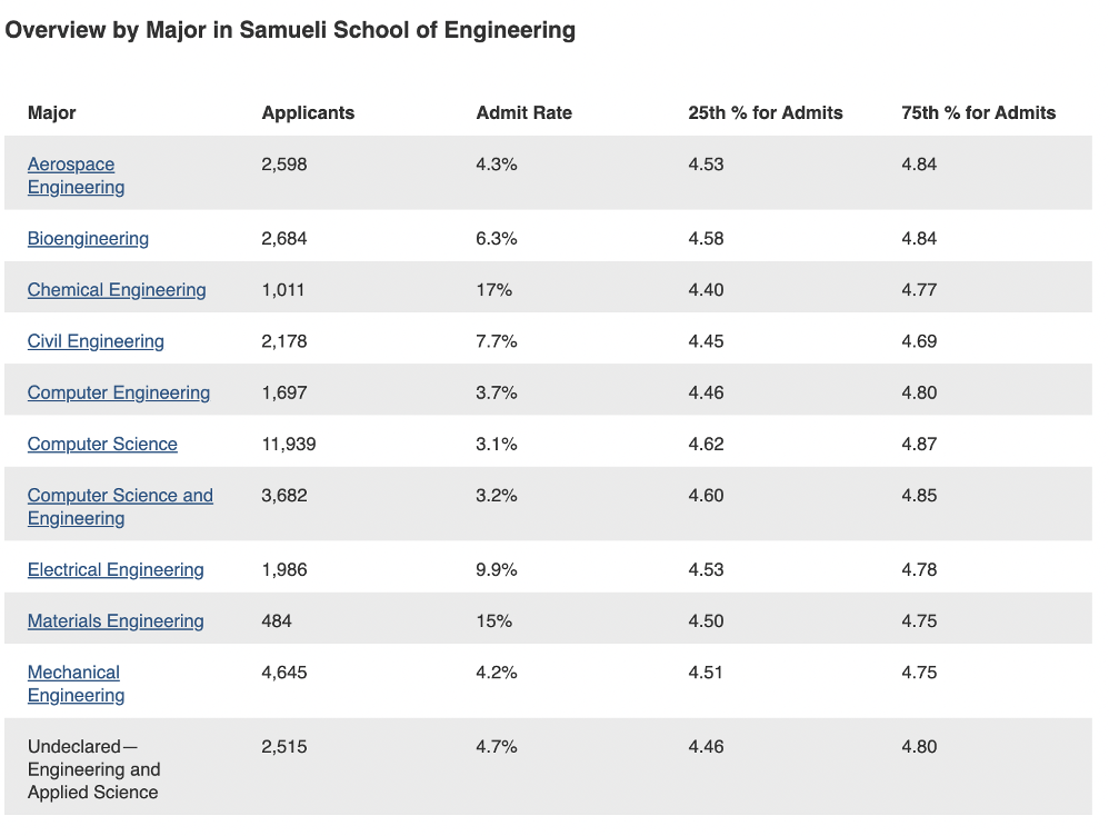 While they haven’t published a specific engineering acceptance rate for the 2024/2025 cycle, they did for . More specifically, Samueli released acceptance rates for each of their 10 majors. They didn’t break down in-state vs. out-of-state rates, but as a rule of thumb, in-state rates will be higher while out-of-state rates will be lower.